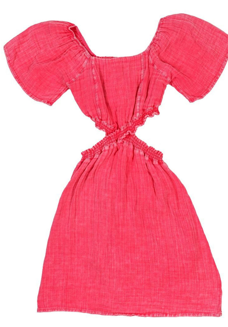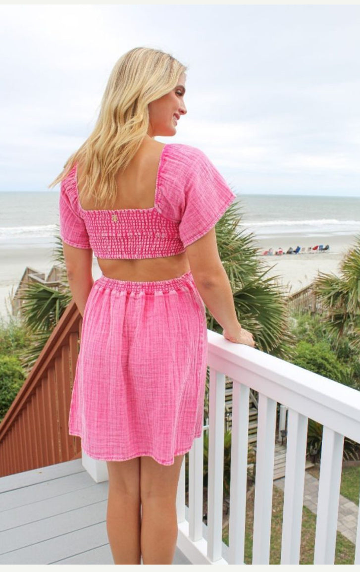 This fun hot pink colored cutout dress can be dressed up or down for any summer day. Features short sleeves and a cutout detail on the waist. Made of 100% cotton