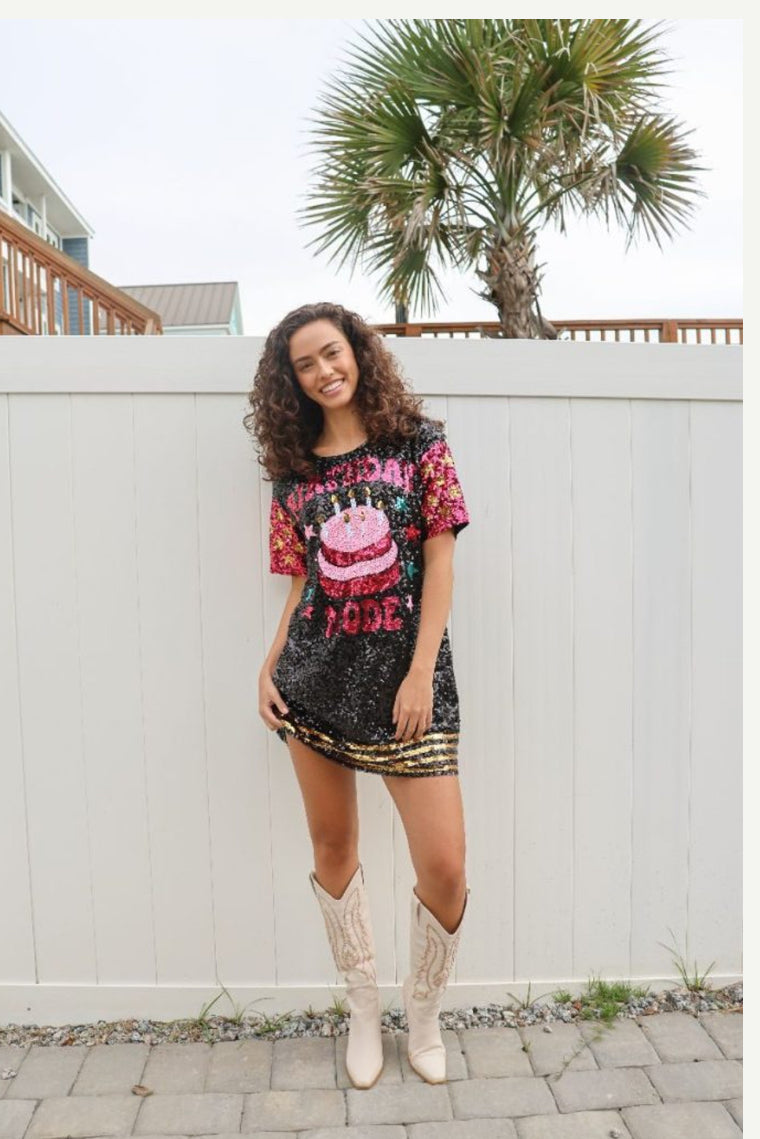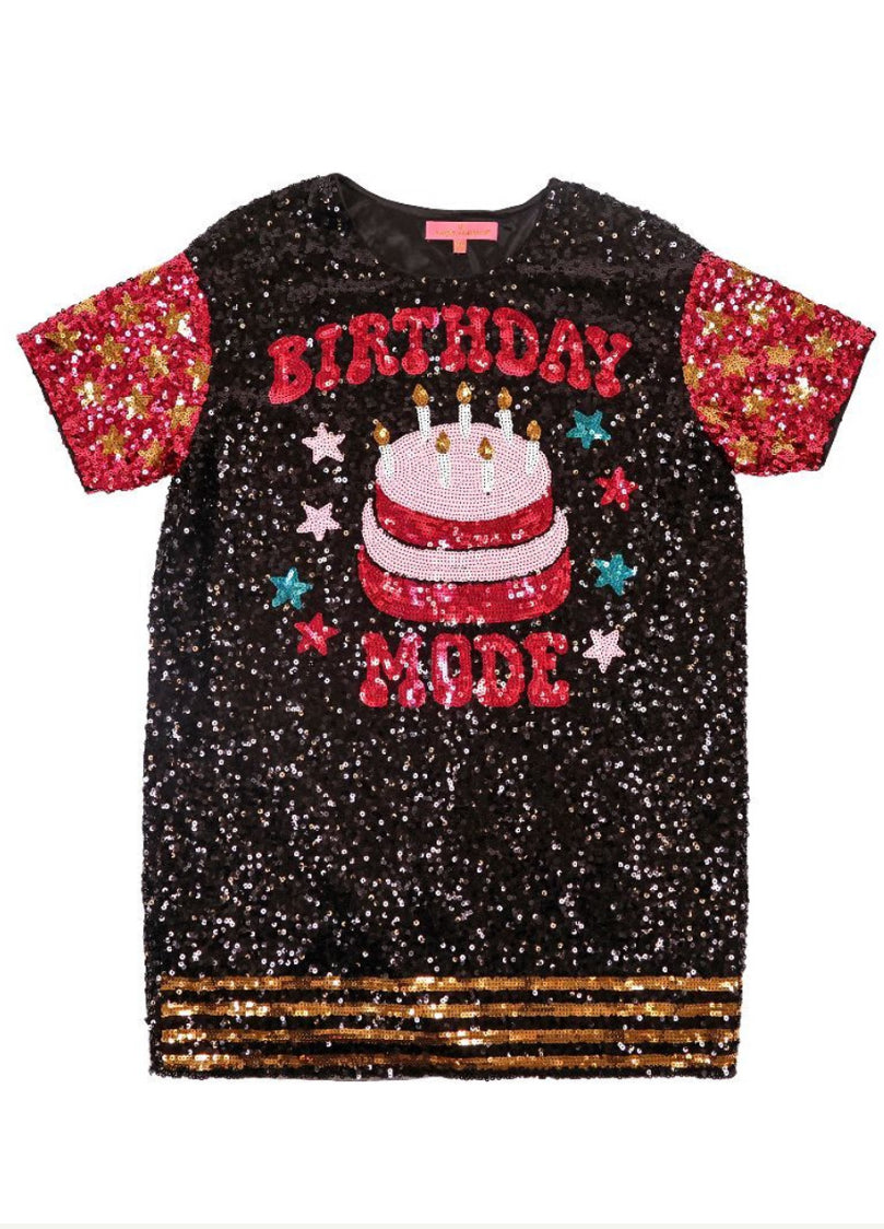 Shine bright with our bedazzling sequin dresses! Made of 70% pet sequin and 30% polyester. This dress is black with a birthday cake and the phrase 'Birthday Mode' on the front.