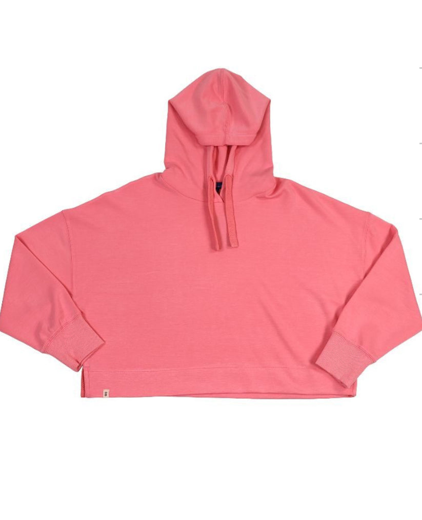 Fun and trendy cropped hoodie with a pineapple woven label on the bottom hem. Made of 48% modal, 48% polyester, and 4% spandex. Color is rose pink.