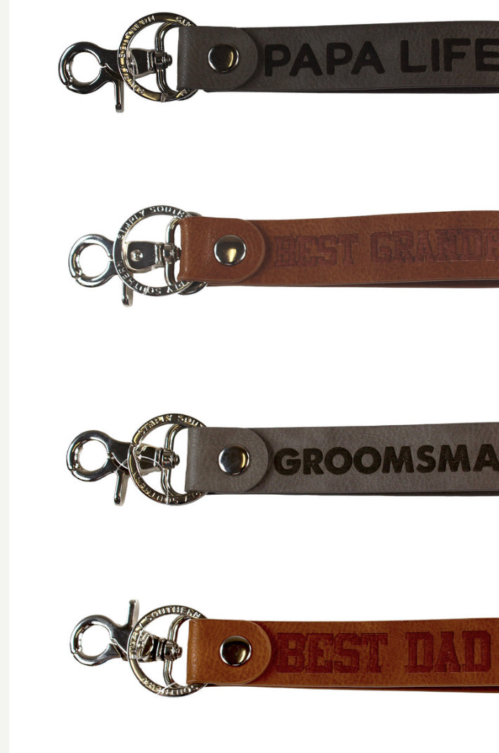 Personalize your keys with our PU leather keychains. Features silver hardware and fun designs