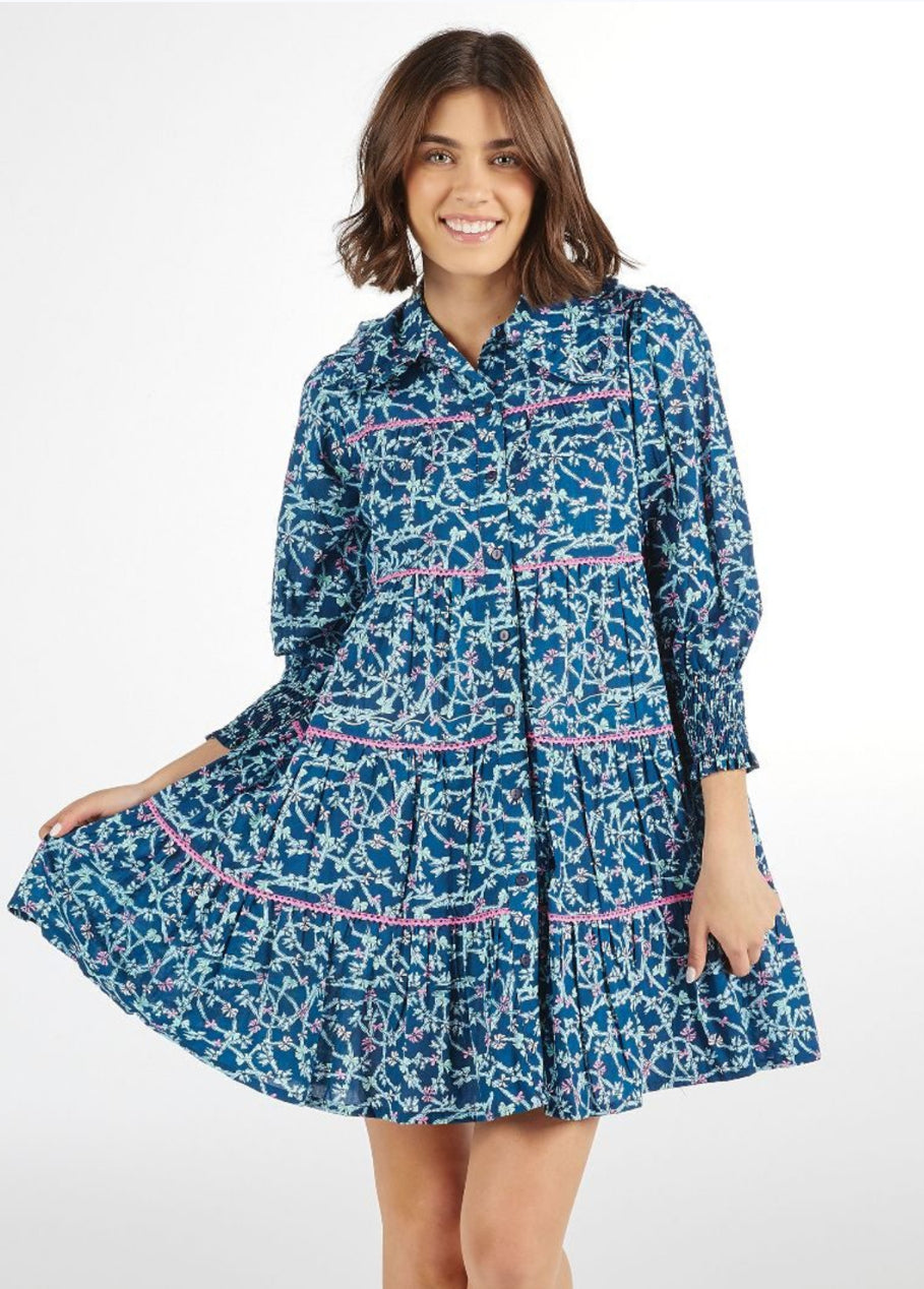 The Allie dress feature babydoll fit with tiered skirt, collared neckline, buttonfront closure, shirred cuffed, midi length and Simply Southern logo label. Made of 100% cotton.