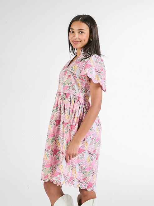The Athena dress features faux wrap dress style droup shoulder sleeves, scallop hem detail, and midi length with Simply Southern logo label.