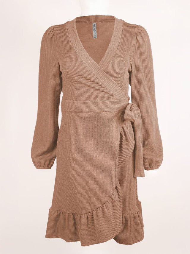 Step out in style with this cute knit wrap dress featuring wrap waist construction, flounce hem, and balloon sleeve. Made of 20% rayon 75% polyester 5% spandex.