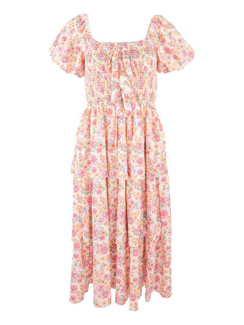 Show up In style in the Lucy dress. It features square neckline with puff sleeves, shirred bodice , tiered skirt, slit in skirt, bows at center front and Simply Southern logo label. Made of 100% polyester.