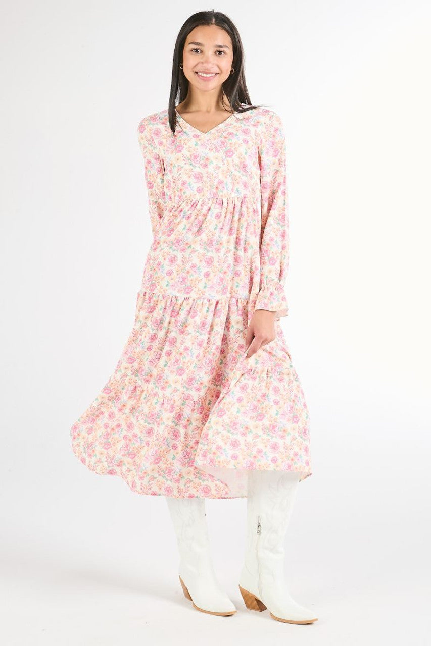 The Mila dress is the perfect seasonal everyday dress. It features Maxi length, flattering wrap bodice design, tiered skirt, full sleeves, v neckline and Simply Souther logo label. Made of 100% polyester.