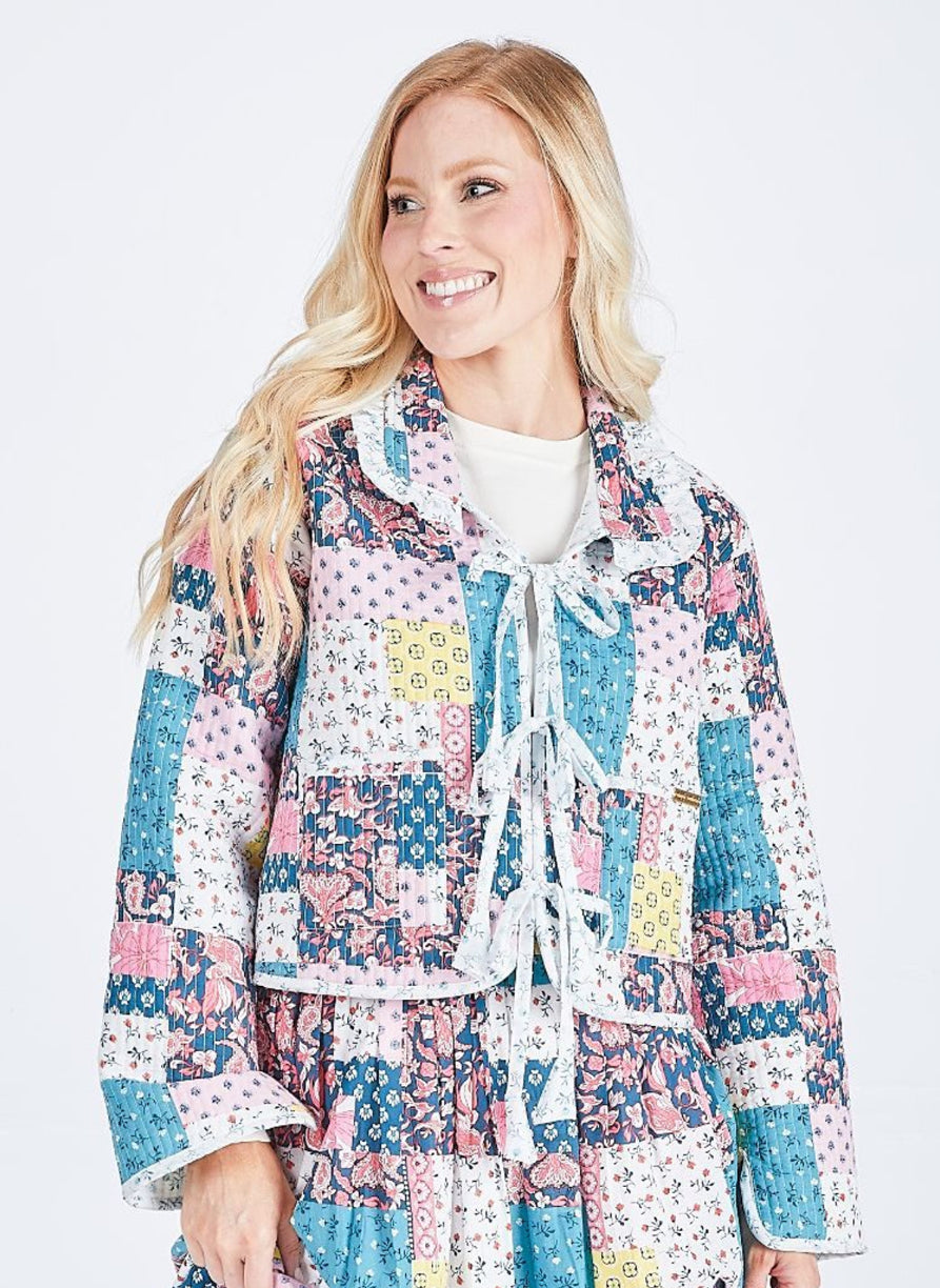 The Ophelia Jacket makes the perfectr layering piece. It features quilted design, ruffle detail collar, tie front closure, patch pockets, contrasting lining, ands Simply Southern logo label. Made of 100% cotton shell with 100% polyester lining.