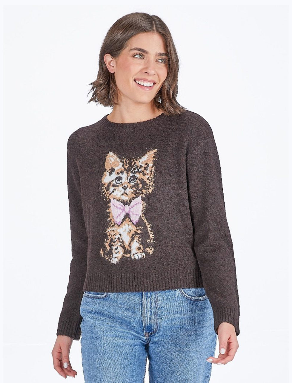 The Anastasia Sweater features multiple designs, crew neckline, relaxed fit, with cozy fuzzy texture. Made of 100% nylon.