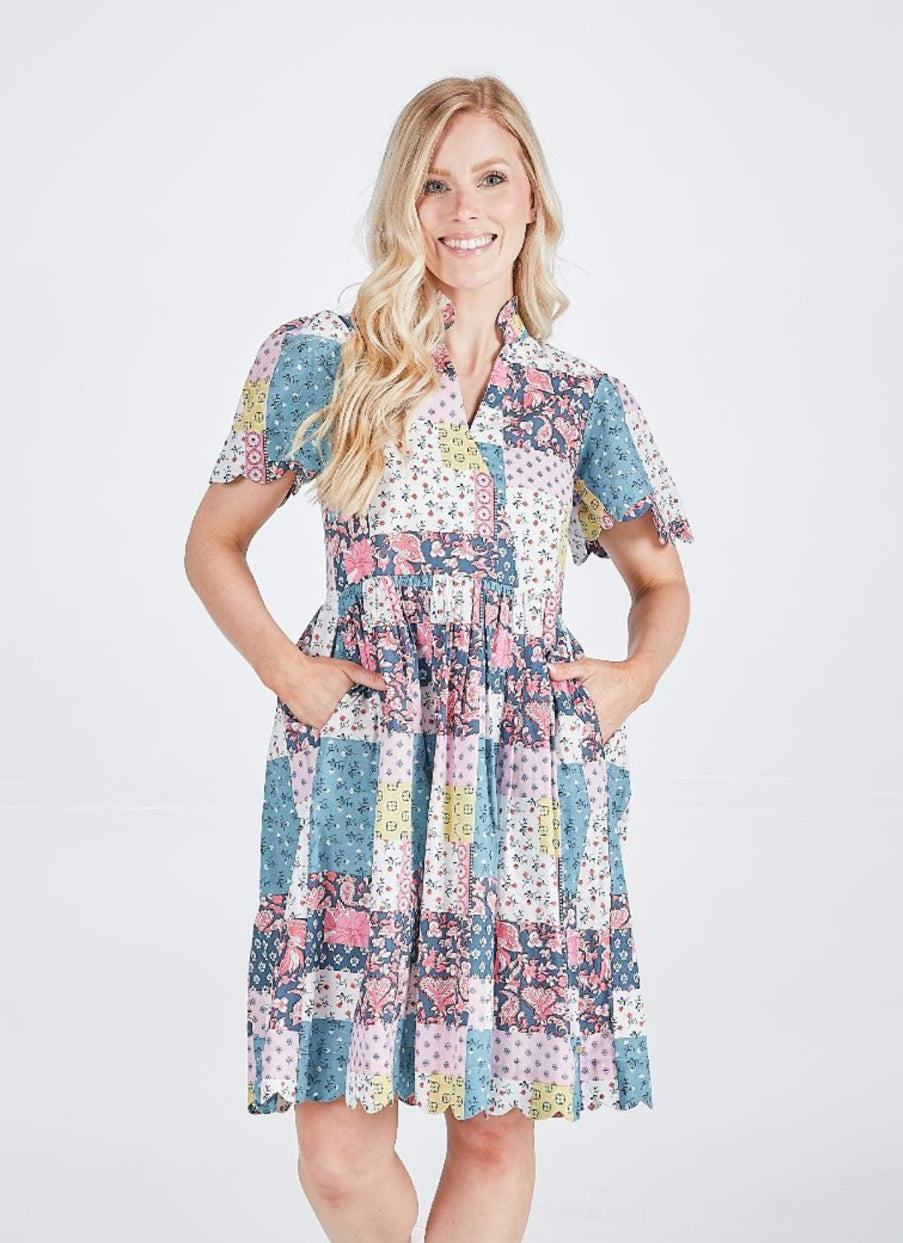 The Athena dress features faux wrap dress style droup shoulder sleeves, scallop hem detail, and midi length with Simply Southern logo label.