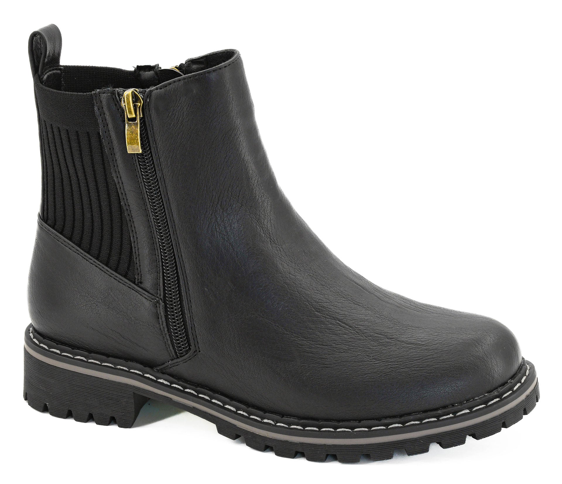 Discover the Corkys Don’t Be Difficult in black, featuring a sleek leather-look finish with precisely stitched detailing for a refined appearance. Its zipper allows easy wear, while ribbed elastic sections ensure a snug and flexible fit. This combination delivers both stylish durability and comfortable movement, ideal for those seeking sophisticated yet practical footwear.