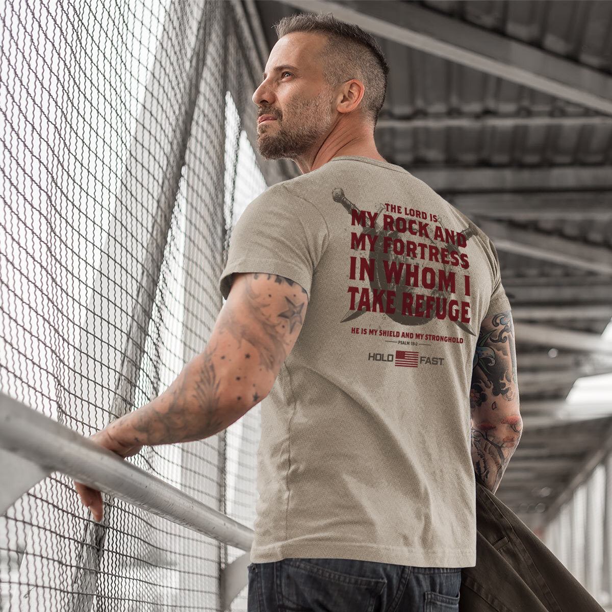 Take a strong stand for faith in this “Fortress Shield” HOLD FAST® T-Shirt in Sand. No foe and no circumstance can stand against you, when you bear the shield of almighty God.