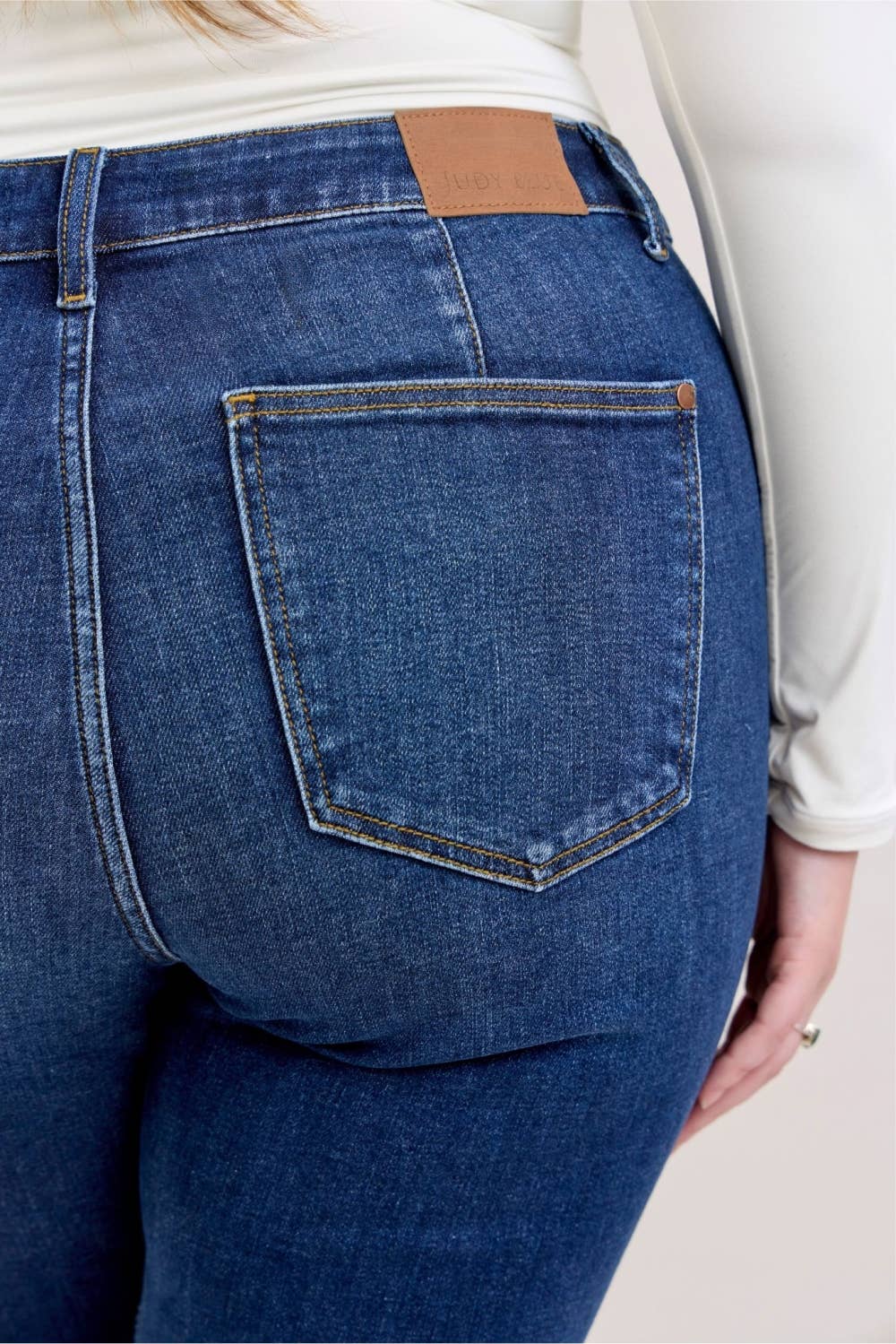 The HW Trouser Flare from Judy Blue Jeans is a high-waisted, flared cut jean, perfect for plus size women. The dark wash makes them versatile for everyday casual wear. Made from a blend of 93% Cotton, 6% Polyester, and 1% Spandex, these jeans offer comfort, stretch, and durability. They are suitable for the fall/winter season and are recommended to be hand washed. The jeans have a front rise of 12 1/4 and an inseam of 32.