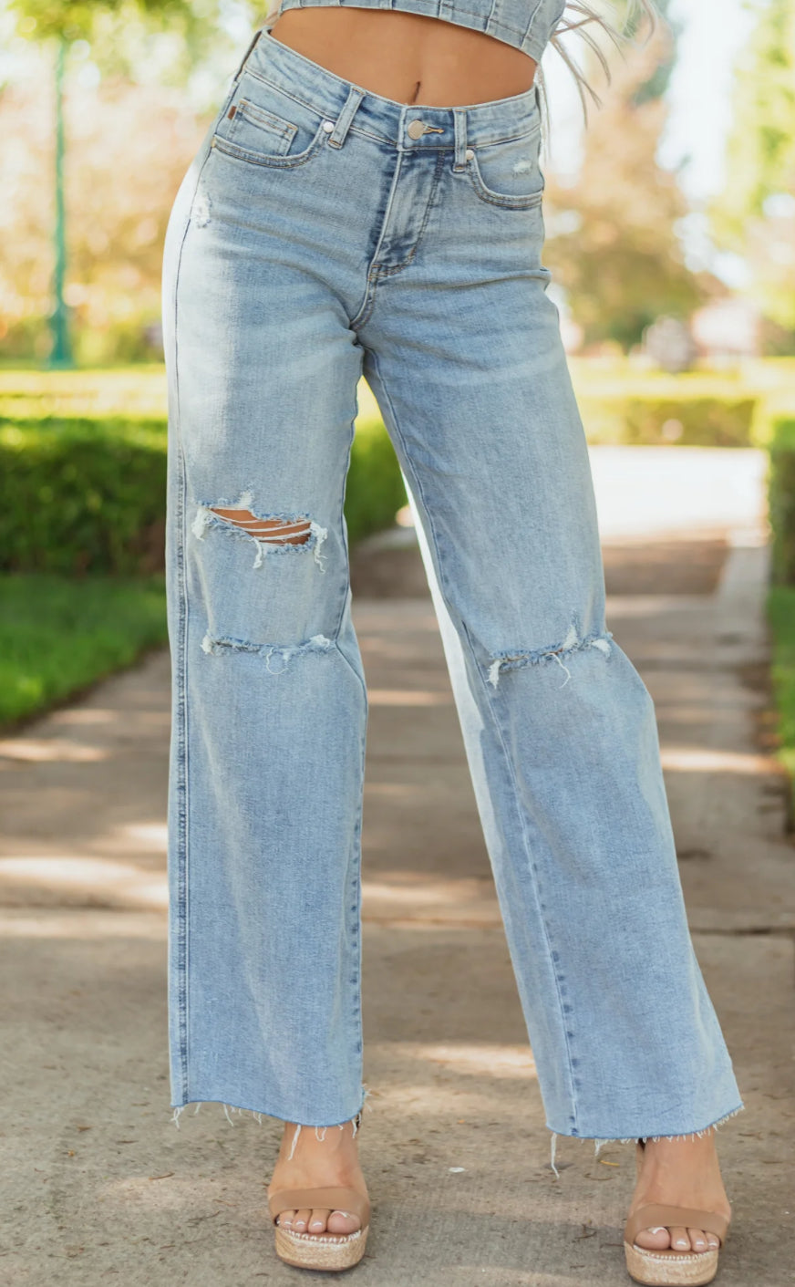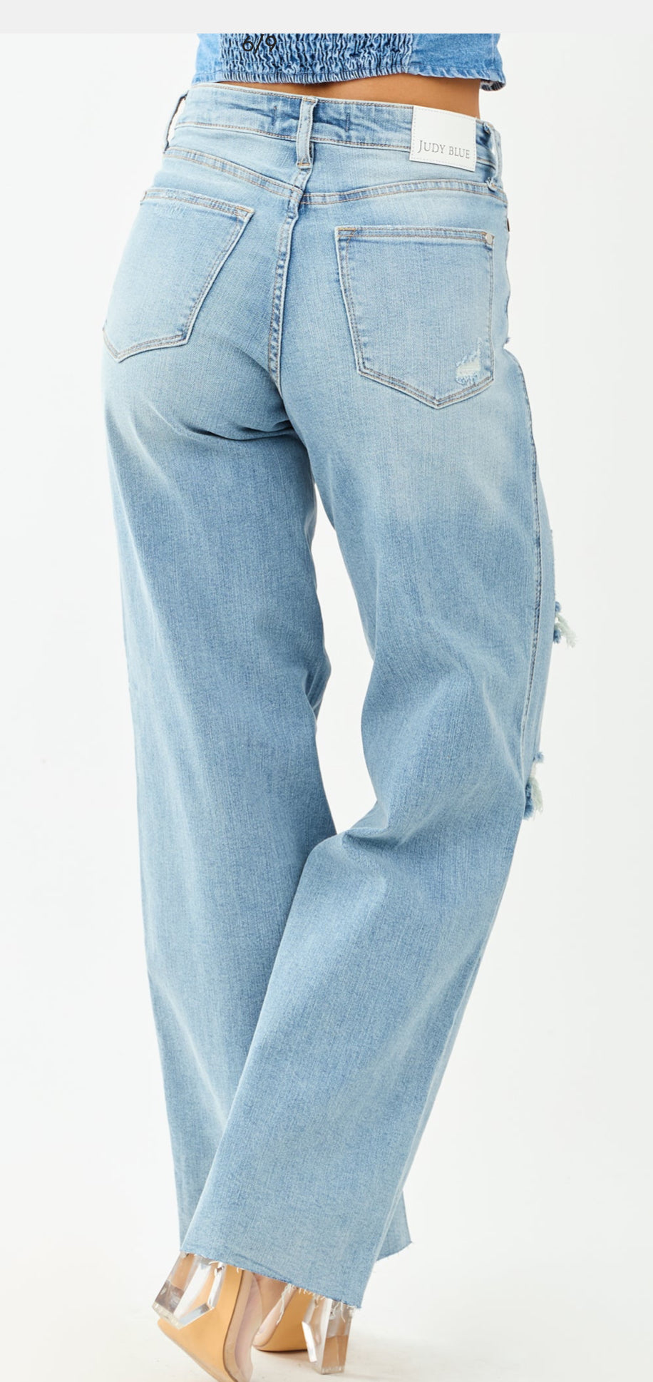 The JB 88933 REG MR jeans offer mid-rise tummy control, perfect for achieving a flattering silhouette. The destroyed wide leg adds a touch of edginess to the light wash denim. Say goodbye to discomfort and hello to style!