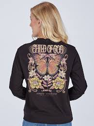 Black long sleeve shirt with the phrase 'Child of God' and a butterfly hovering over flowers. Simply Southern logo below, on left chest, and along right sleeve. 100% cotton. Unisex sizing.