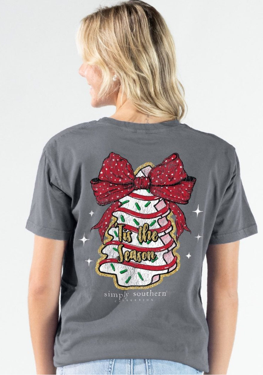 Mineral washed coal short sleeve shirt with the phrase ''Tis the Season' on a cake in the shape of a Christmas tree topped with a red bow. Simply Southern logo below. Similar design on the left chest. 100% cotton. Unisex sizing.