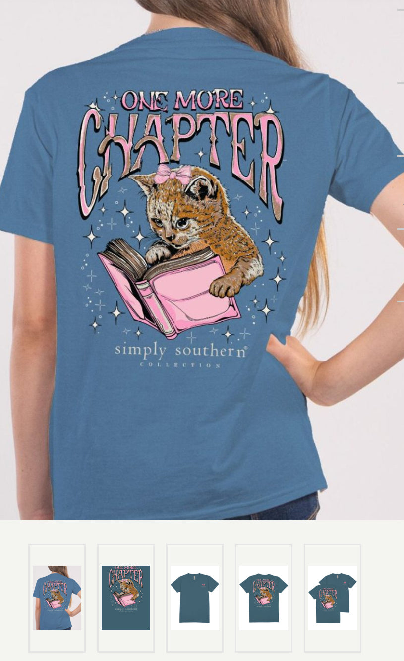 "Get ready to pounce on this purr-fectly playful SS-CHAPTER-COMET- shirt! Featuring a short sleeve design and a cute Simply Southern kitten reading a book, it's the cat's meow for any bookworm. Grab yours meow!"