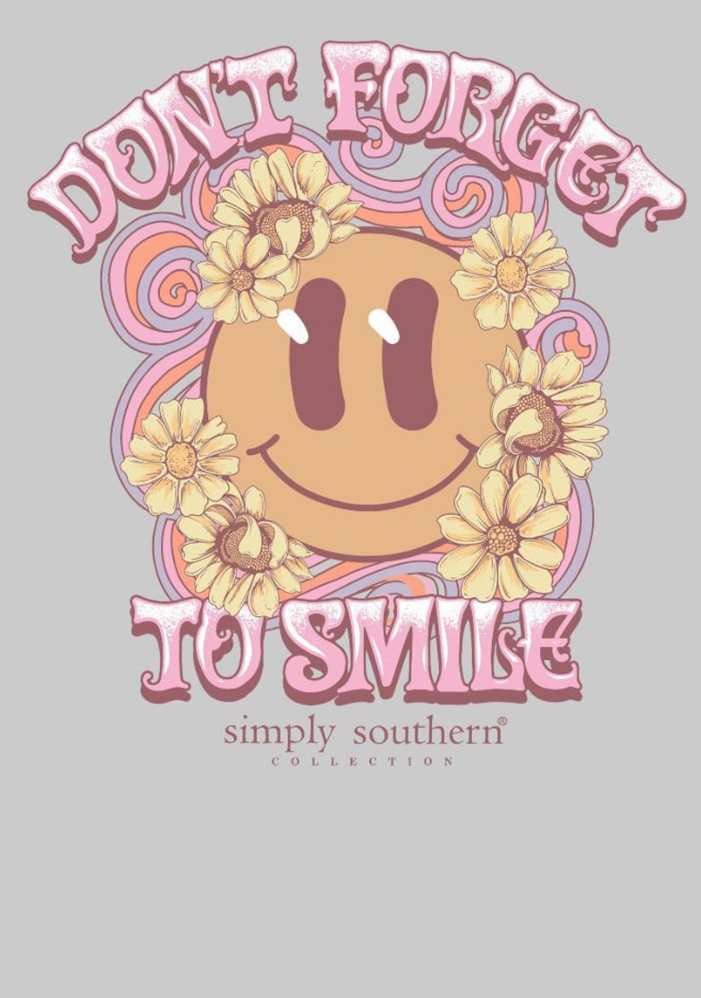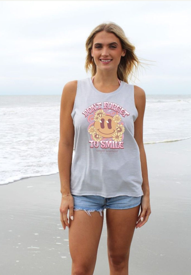 Grey tank top with the phrase 'Don't forget to smile' and a smiley with flowers on front. Simply Southern logo below and similar design on upper back. 100% cotton. Unisex sizing.