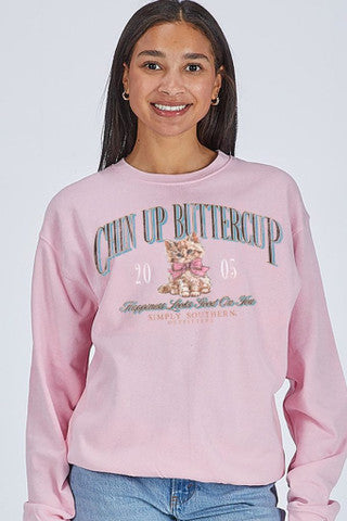 Tutu pink long sleeve crew with the phrase 'Chin up buttercup, Happiness looks good on you' and a cute kitten. 60% cotton/40% polyester blend. Range sizing.