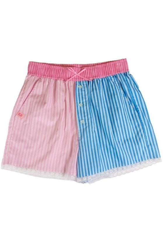 Take it easy and relax in these super cute shorts. They feature striped design, elastic waistband with bow ribbon at center front, faux button front, front pockets, lace detailing at hem and Simply Southern logo label on the pocket.